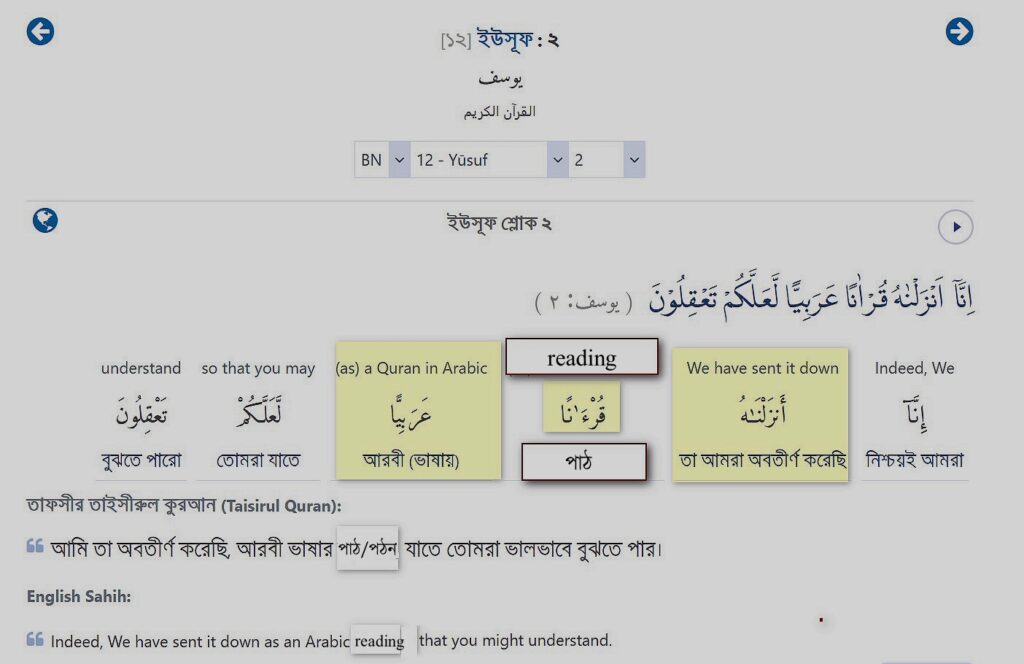 ১২:২ নিশ্চয়ই আমি নাযিল করেছি (اِنَّآ اَنْزَلْنٰهُ) আরবি পাঠ/পঠন (قُرْاٰنًا عَرَبِيًّا)- যাতে তোমরা বুঝতে পার (لَّعَلَّكُمْ تَعْقِلُوْنَ)!