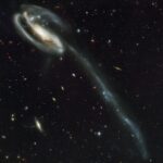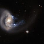 NGC 7714 is a spiral galaxy 100 million light-years from Earth — a relatively close neighbour in cosmic terms. The galaxy has witnessed some violent and dramatic events in its recent past. Tell-tale signs of this brutality can be seen in NGC 7714’s strangely shaped arms, and in the smoky golden haze that stretches out from the galactic centre — caused by an ongoing merger with its smaller galactic companion NGC 7715, which is out of the frame of this image.