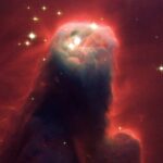 Resembling a nightmarish beast rearing its head from a crimson sea, this celestial object is actually just a pillar of gas and dust. Called the Cone Nebula (in NGC 2264) – so named because in ground-based images it has a conical shape – this monstrous pillar resides in a turbulent star-forming region. This picture, taken by the newly installed Advanced Camera for Surveys (ACS) aboard the NASA/ESA Hubble Space Telescope, shows the upper 2.5 light-years of the Cone, a height that equals 23 million roundtrips to the Moon. The entire pillar is seven light-years long. Radiation from hot, young stars (located beyond the top of the image) has slowly eroded the nebula over millions of years. Ultraviolet light heats the edges of the dark cloud, releasing gas into the relatively empty region of surrounding space. There, additional ultraviolet radiation causes the hydrogen gas to glow, which produces the red halo of light seen around the pillar. A similar process occurs on a much smaller scale to gas surrounding a single star, forming the bow-shaped arc seen near the upper left side of the Cone. This arc, seen previously with the Hubble telescope, is 65 times larger than the diameter of our Solar System. The blue-white light from surrounding stars is reflected by dust. Background stars can be seen peeking through the evaporating tendrils of gas, while the turbulent base is pockmarked with stars reddened by dust. Over time, only the densest regions of the Cone will be left. But inside these regions, stars and planets may form. The Cone Nebula resides 2500 light-years away in the constellation Monoceros. The Cone is a cousin of the M16 pillars, which the Hubble telescope imaged in 1995. Consisting mainly of cold gas, the pillars in both regions resist being eroded away by the blistering ultraviolet radiation from young, massive stars. Pillars like the Cone and M16 are common in large regions of star birth. Astronomers believe that these pillars may be incubators for developing s