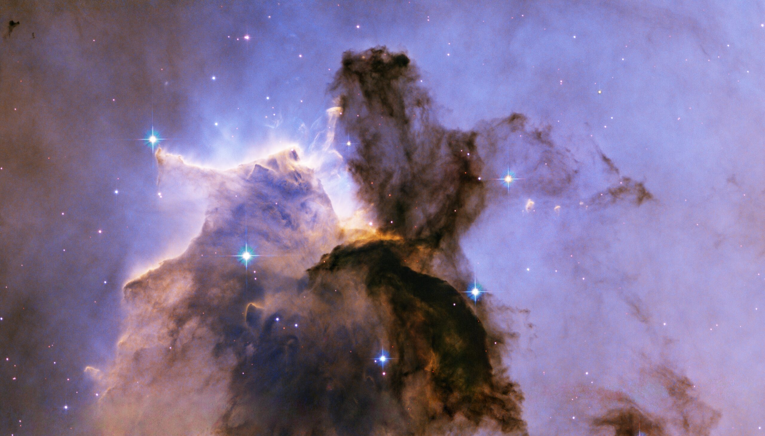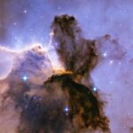 Appearing like a winged fairy-tale creature poised on a pedestal, this object is actually a billowing tower of cold gas and dust rising from a stellar nursery called the Eagle Nebula. The soaring tower is 9.5 light-years or about 90 trillion kilometres high, about twice the distance from our Sun to the next nearest star. Stars in the Eagle Nebula are born in clouds of cold hydrogen gas that reside in chaotic neighbourhoods, where energy from young stars sculpts fantasy-like landscapes in the gas. The tower may be a giant incubator for those newborn stars. A torrent of ultraviolet light from a band of massive, hot, young stars [off the top of the image] is eroding the pillar. The starlight also is responsible for illuminating the tower’s rough surface. Ghostly streamers of gas can be seen boiling off this surface, creating the haze around the structure and highlighting its three-dimensional shape. The column is silhouetted against the background glow of more distant gas. The edge of the dark hydrogen cloud at the top of the tower is resisting erosion, in a manner similar to that of brush among a field of prairie grass that is being swept up by fire. The fire quickly burns the grass but slows down when it encounters the dense brush. In this celestial case, thick clouds of hydrogen gas and dust have survived longer than their surroundings in the face of a blast of ultraviolet light from the hot, young stars. Inside the gaseous tower, stars may be forming. Some of those stars may have been created by dense gas collapsing under gravity. Other stars may be forming due to pressure from gas that has been heated by the neighbouring hot stars. The first wave of stars may have started forming before the massive star cluster began venting its scorching light. The star birth may have begun when denser regions of cold gas within the tower started collapsing under their own weight to make stars. The bumps and fingers of material in the centre of the tower are examples of these ste