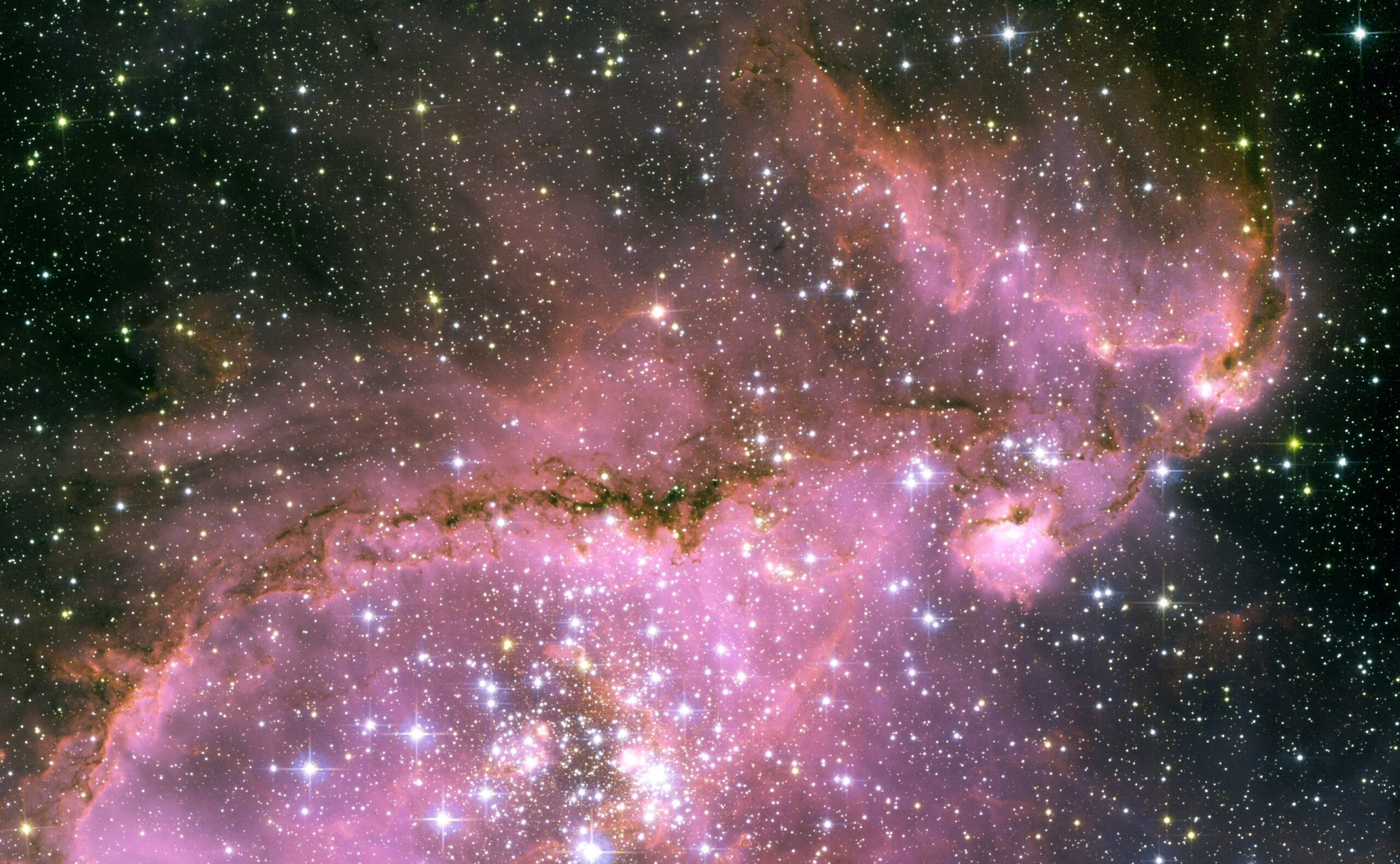 The NASA/ESA Hubble Space Telescope captures the iridescent tapestry of star birth in a neighbouring galaxy in this panoramic view of glowing gas, dark dust clouds, and young, hot stars. The star-forming region, catalogued as N11B lies in the Large Magellanic Cloud (LMC), located only 160,000 light-years from Earth. With its high resolution, the Hubble Space Telescope is able to view details of star formation in the LMC as easily as ground-based telescopes are able to observe stellar formation within our own Milky Way galaxy. Our neighbourhood galaxy the Large Magellanic Cloud (LMC) lies in the Constellation of Dorado and is sprinkled with a number of regions harbouring recent and ongoing star formation. One of these star-forming region, N11B, is shown in this Hubble image. It is a subregion within a larger area of star formation called N11. N11 is the second largest star-forming region in LMC. It is only surpassed in the size and activity by “the king of stellar nurseries”, 30 Doradus, located at the opposite side of LMC.