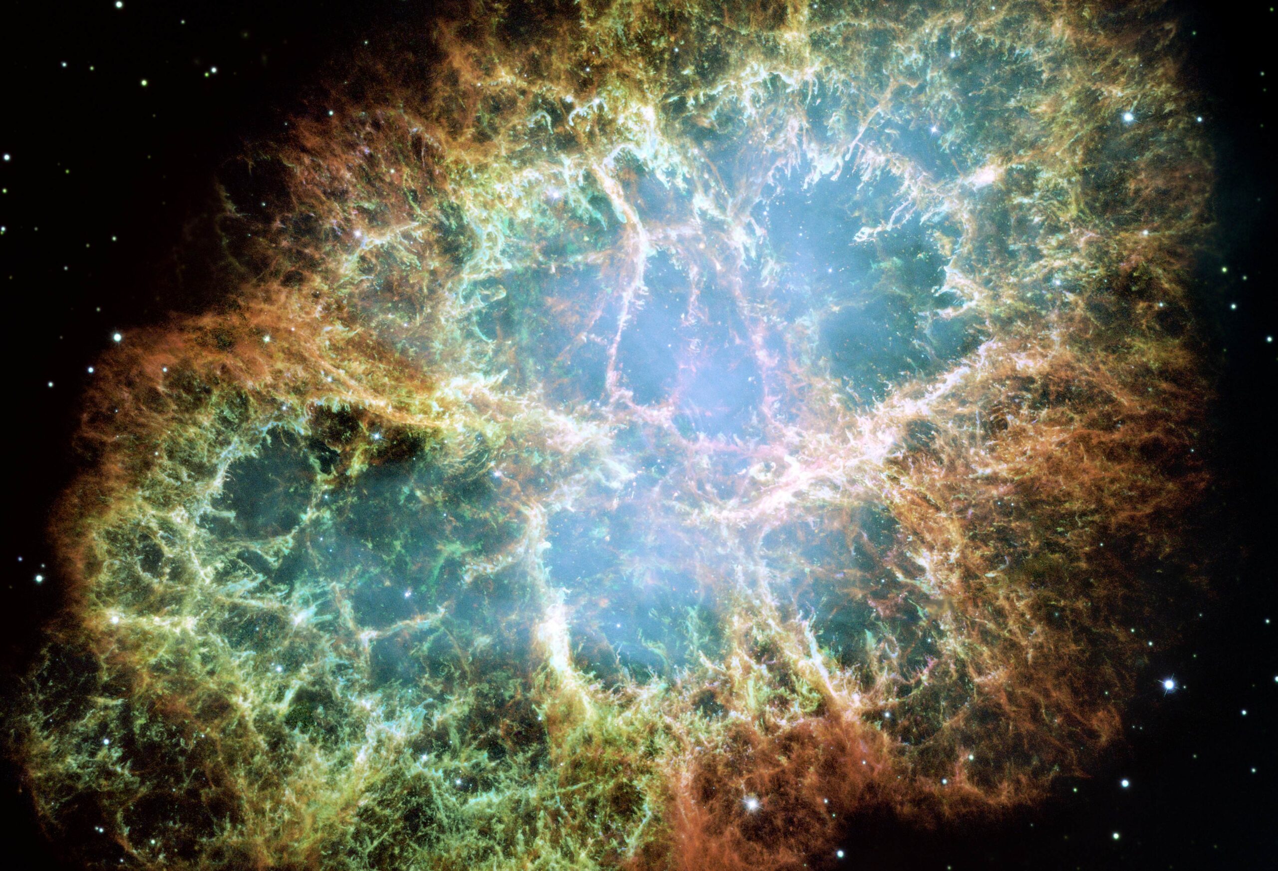 This Hubble image gives the most detailed view of the entire Crab Nebula ever. The Crab is among the most interesting and well studied objects in astronomy. This image is the largest image ever taken with Hubble’s WFPC2 camera. It was assembled from 24 individual exposures taken with the NASA/ESA Hubble Space Telescope and is the highest resolution image of the entire Crab Nebula ever made.
