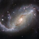 The barred spiral galaxy NGC 1672, showing up clusters of hot young blue stars along its spiral arms, and clouds of hydrogen gas glowing in red. Delicate curtains of dust partially obscure and redden the light of the stars behind them. NGC 1672’s symmetric look is emphasised by the four principal arms, edged by eye-catching dust lanes that extend out from the centre.