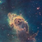 This craggy fantasy mountaintop enshrouded by wispy clouds looks like a bizarre landscape from Tolkien’s The Lord of the Rings. The NASA/ESA Hubble Space Telescope image, which is even more dramatic than fiction, captures the chaotic activity atop a pillar of gas and dust, three light-years tall, which is being eaten away by the brilliant light from nearby bright stars. The pillar is also being assaulted from within, as infant stars buried inside it fire off jets of gas that can be seen streaming from towering peaks. This turbulent cosmic pinnacle lies within a tempestuous stellar nursery called the Carina Nebula, located 7500 light-years away in the southern constellation of Carina. The image celebrates the 20th anniversary of Hubble’s launch and deployment into an orbit around the Earth. Scorching radiation and fast winds (streams of charged particles) from super-hot newborn stars in the nebula are shaping and compressing the pillar, causing new stars to form within it. Streamers of hot ionised gas can be seen flowing off the ridges of the structure, and wispy veils of gas and dust, illuminated by starlight, float around its towering peaks. The denser parts of the pillar are resisting being eroded by radiation. Nestled inside this dense mountain are fledgling stars. Long streamers of gas can be seen shooting in opposite directions from the pedestal at the top of the image. Another pair of jets is visible at another peak near the centre of the image. These jets, (known as HH 901 and HH 902, respectively, are signposts for new star birth and are launched by swirling gas and dust discs around the young stars, which allow material to slowly accrete onto the stellar surfaces. Hubble’s Wide Field Camera 3 observed the pillar on 1-2 February 2010. The colours in this composite image correspond to the glow of oxygen (blue), hydrogen and nitrogen (green), and sulphur (red).