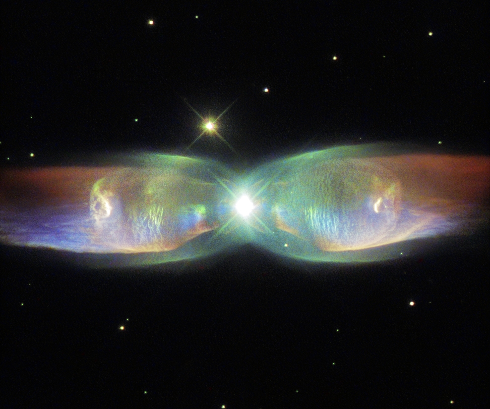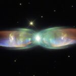 The Twin Jet Nebula, or PN M2-9, is a striking example of a bipolar planetary nebula. Bipolar planetary nebulae are formed when the central object is not a single star, but a binary system, Studies have shown that the nebula’s size increases with time, and measurements of this rate of increase suggest that the stellar outburst that formed the lobes occurred just 1200 years ago.