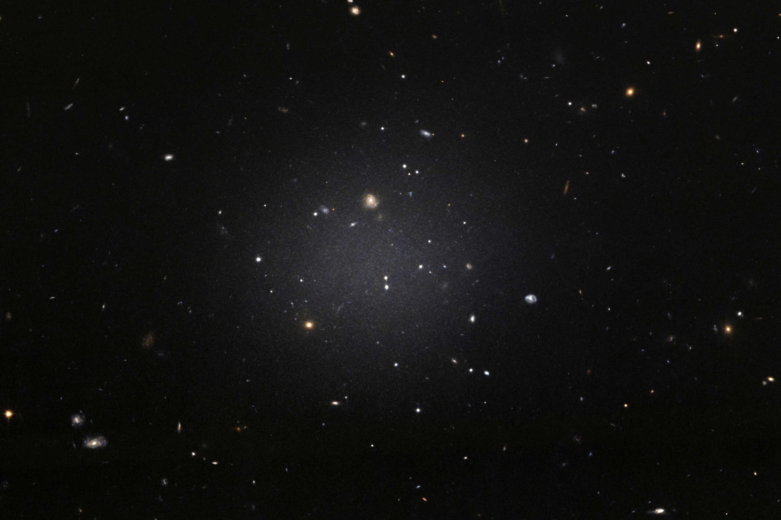 NGC 1052-DF2 resides about 65 million light-years away in the NGC 1052 Group, which is dominated by a massive elliptical galaxy called NGC 1052. This large, fuzzy-looking galaxy is so diffuse that astronomers can clearly see distant galaxies behind it. This ghostly galaxy is not well-formed. It does not look like a typical spiral galaxy, but it does not look like an elliptical galaxy either. Based on the colours of its globular clusters, the galaxy is about 10 billion years old. However, even the globular clusters are strange: they are twice as large as typical groups of stars. All of these oddities pale in comparison to the weirdest aspect of this galaxy: NGC 1052-DF2 is missing most, if not all, of its dark matter. The galaxy contains only a tiny fraction of dark matter that astronomers would expect for a galaxy this size. But how it formed is a complete mystery. Hubble took this image on 16 November 2017 using its Advanced Camera for Surveys.
