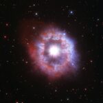This new image shows the dramatic shape and colour of the Ring Nebula, otherwise known as Messier 57. From Earth’s perspective, the nebula looks like a simple elliptical shape with a shaggy boundary. However, new observations combining existing ground-based data with new NASA/ESA Hubble Space Telescope data show that the nebula is shaped like a distorted doughnut. This doughnut has a rugby-ball-shaped region of lower-density material slotted into in its central “gap”, stretching towards and away from us.