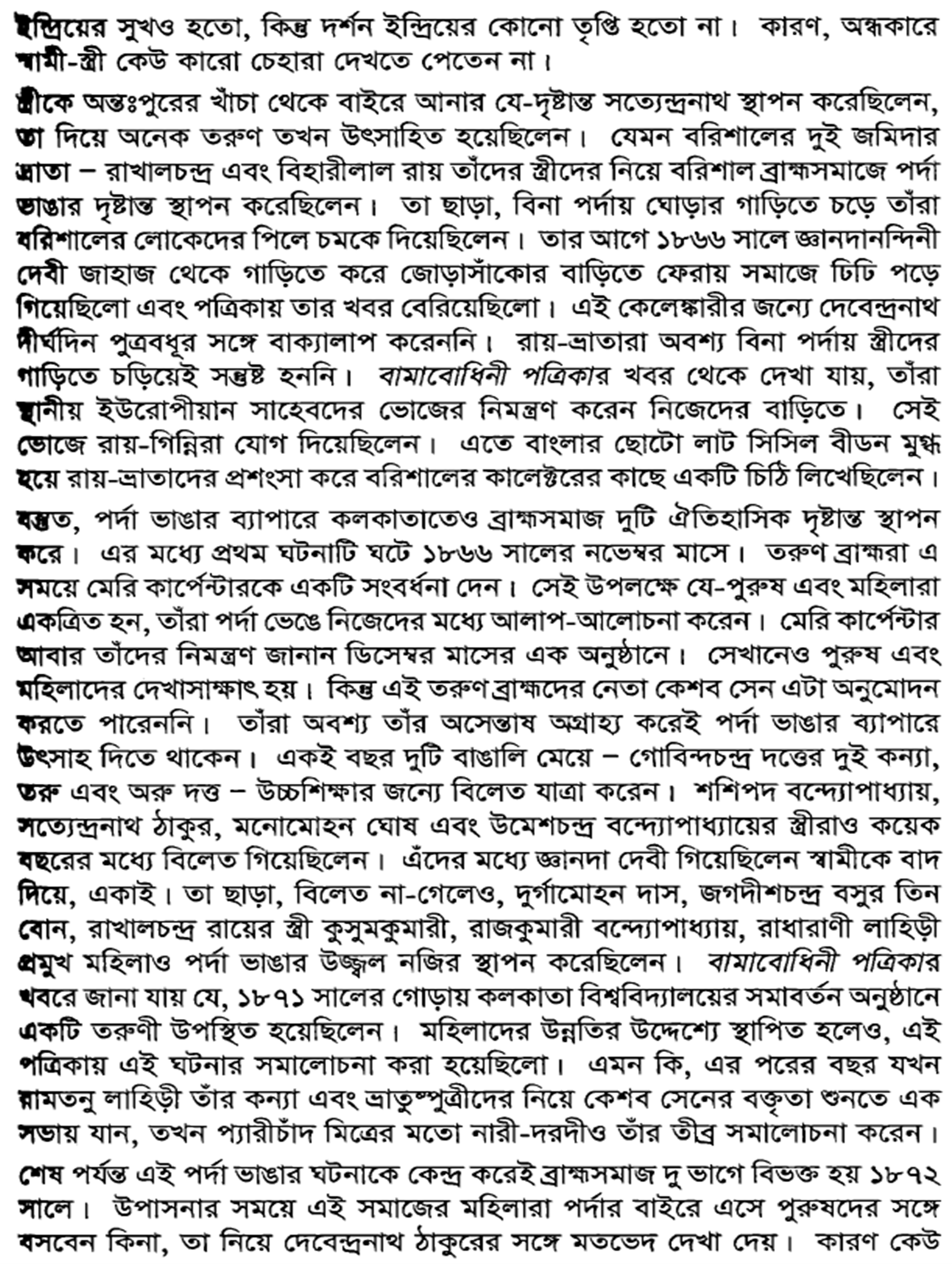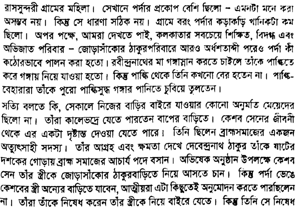উপরোক্ত ঐতিহাসিক প্রেক্ষাপটের সংক্ষিপ্ত আলোচনা থেকে বোঝা যায়, ভারতীয় বাংলা অঞ্চলে হিন্দু মুসলিম উভয় সমাজে পর্দা প্রথার কঠোর প্রচলন ছিল। মুসলিম নারীগণ বোরকা পরতেন; তবে, হিন্দু ধর্মাবলম্বীরা তাদের মতো করে সমাজ-সভ্যতা থেকে গৃহাভ্যন্তরে নিজেদের আড়াল করে রাখতেন।