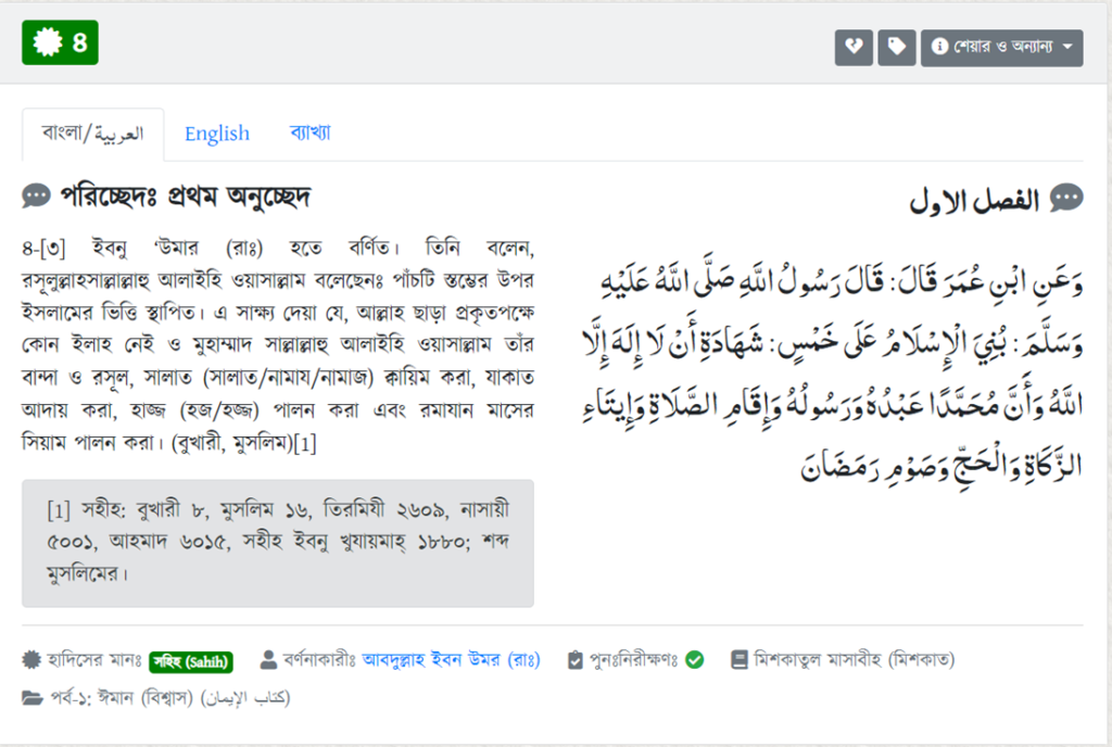 এই হাদিসটি পাওয়া যাবে এখানে (https://sunnah.com/bukhari:8) ; বর্ণনাসূত্র হলো-حَدَّثَنَا عُبَيْدُ اللَّهِ بْنُ مُوسَى، قَالَ أَخْبَرَنَا حَنْظَلَةُ بْنُ أَبِي سُفْيَانَ، عَنْ عِكْرِمَةَ بْنِ خَالِدٍ، عَنِ ابْنِ عُمَرَ ـ رضى الله عنهما ـ قَالَ قَالَ رَسُولُ اللَّهِ صلى الله عليه وسلم উবায়দুল্লাহ ইবনে মুসা থেকে বর্ণিত, হানযালাহ ইবনে আবি সুফিয়ান জানিয়েছেন ইকরিমা বিন খালিদের বরাত দিয়ে; তিনি শুনেছেন ইবনে উমর থেকে। সবশেষে উবায়দুল্লাহ ইবনে মুসা থেকে ইমাম বুখারি শুনেছেন এই হাদিস।