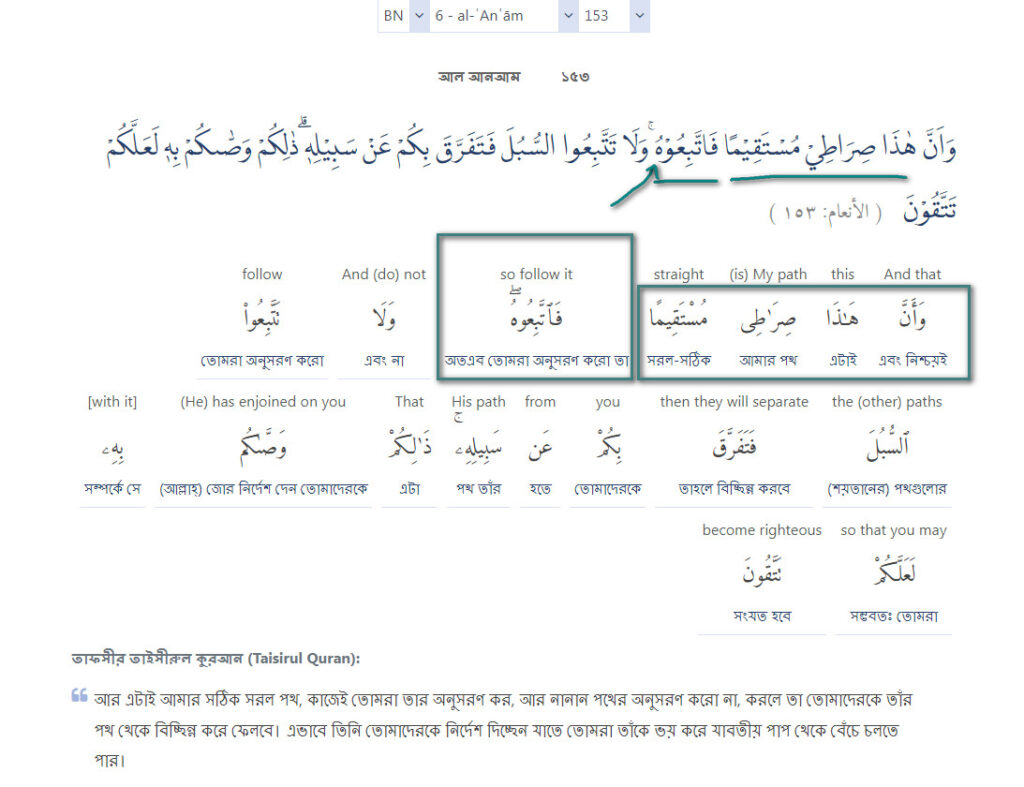 ওয়া আন্না হাযা সিরত্বি মুস্তাকিমান ফাত্তাবিয়ু-হু; ওয়া লা তাত্তাবিয়ুস্ সুবুলা ফা-তাফাররকা বিকুম আন সাবিলিহ; যালিকুম ওয়াস্স্বকুম বিহি লা’আল্লাকুম তাত্তাকুন। ১৫৩