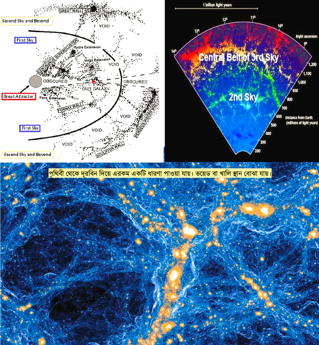 এমনতর বিলিয়ন-ট্রিলিয়ন-যিলিয়ন এবং আরও অগনিত যমিন আছে এই মহাবিশ্বে। হাবল টেলিস্কোপ ও নানা অবজারভেটরির রেডিও টেলিস্কোপের সাহায্যে মোটামুটি দুই স্তরের আসমানের অস্তিত্ব টের পাওয়া যায়। এর স্তরগুলোর মাঝে রয়েছে ভয়েড বা খালি স্থান যা বোঝা যায়। এই ভয়েডই মূলত আকাশের গ্যালাক্সি ও অন্যান্য উপাদানের উপস্থিতি নিশ্চিত করে।